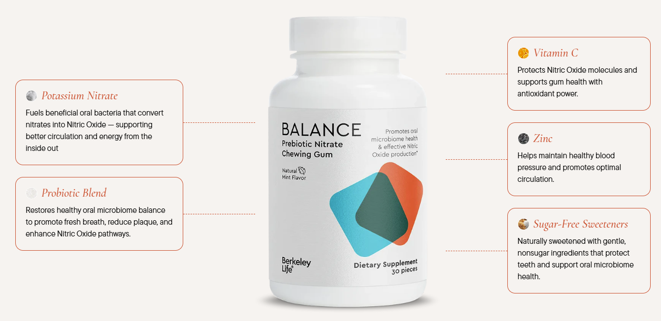 At Berkeley Life, we’ve always believed that supporting your Nitric Oxide pathways should be simple, science-backed, and something you actually enjoy using. So, we took our original Balance Prebiotic Nitrate Gum (a customer favorite!) and gave it a smart, meaningful upgrade - without changing the daily habit you already love.